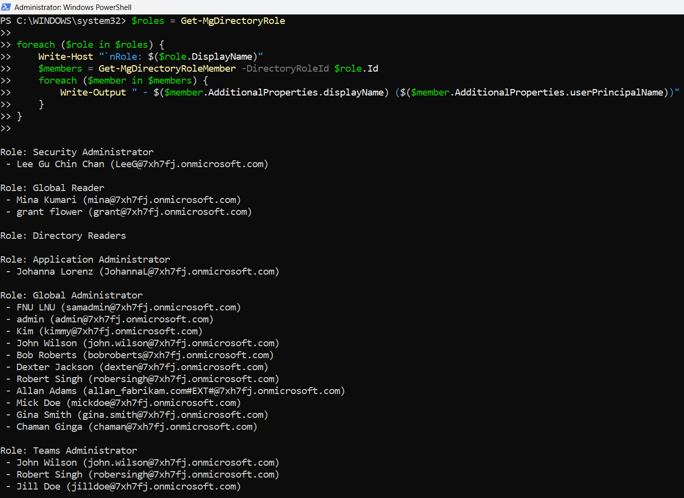 $globalAdmins = Get-MgDirectoryRoleMember -DirectoryRoleId $globalAdminRole.Id -All