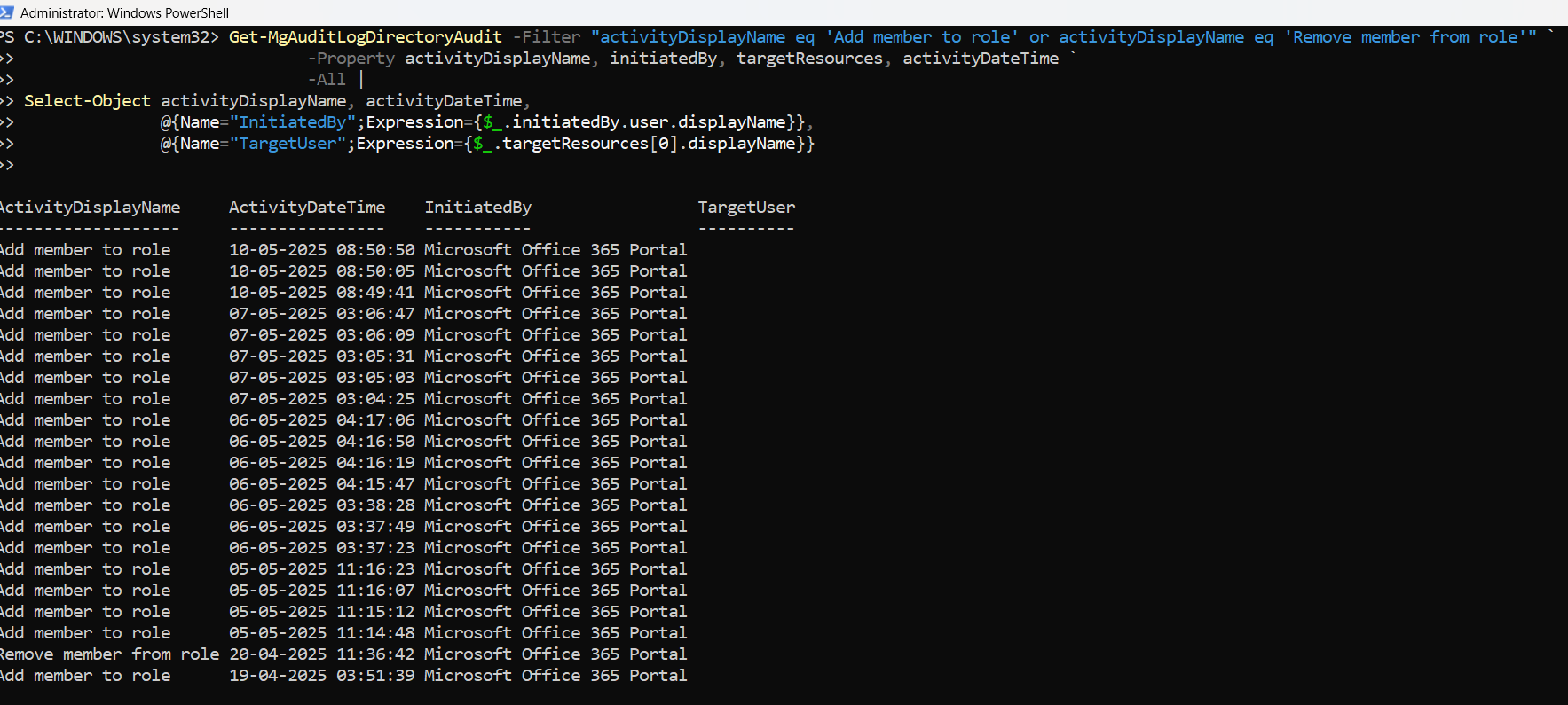 Get-MgAuditLogDirectoryAudit -Filter "activityDisplayName eq 'Add member to role' or activityDisplayName eq 'Remove member from role'" `