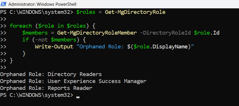 Write-Output "Orphaned Role: $($role.DisplayName)"