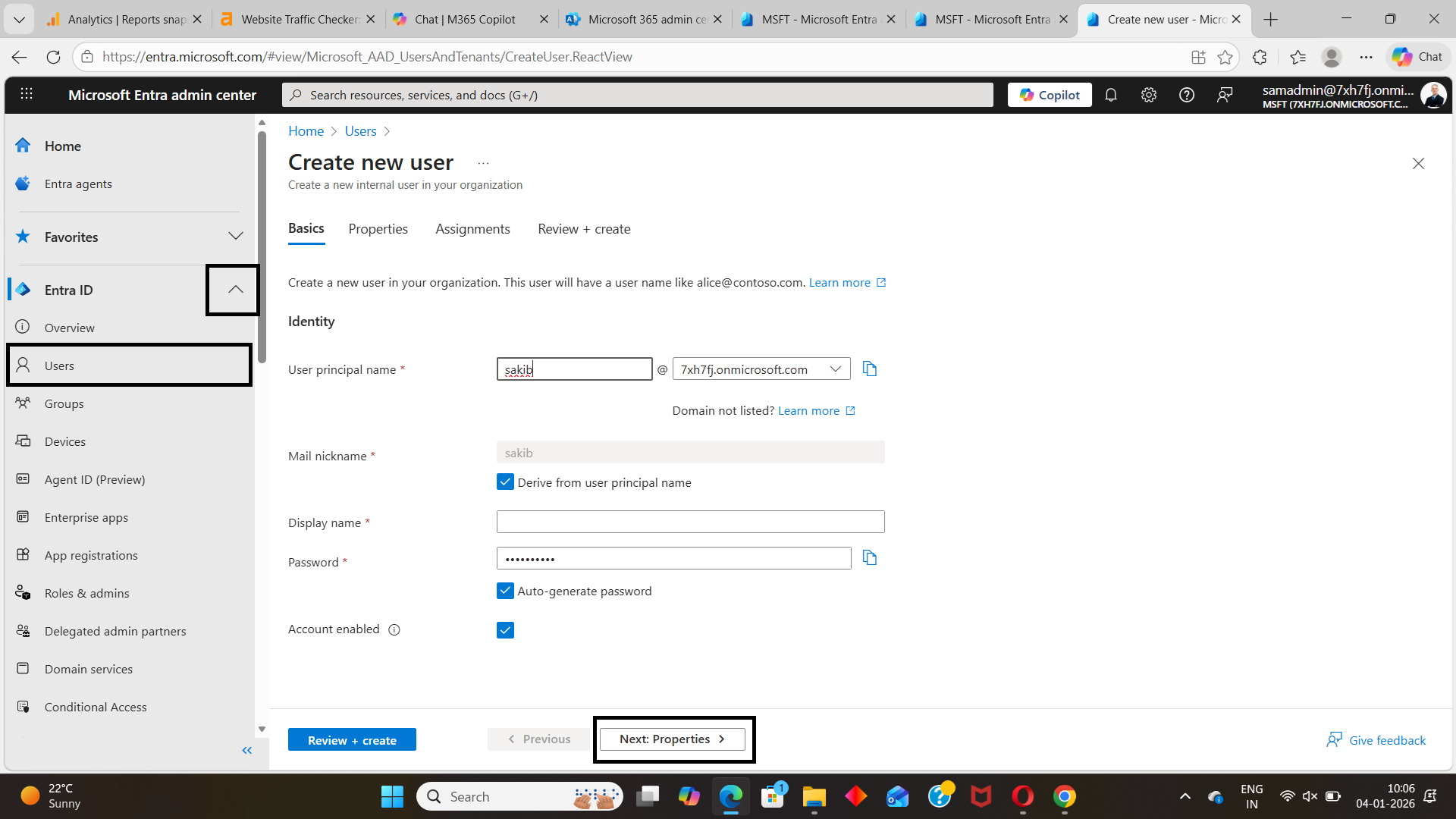 When creating a new user in Entra ID, the foundation is set in the Basics and Properties tabs. These tabs define the user’s identity and how they appear across Microsoft 365 services.