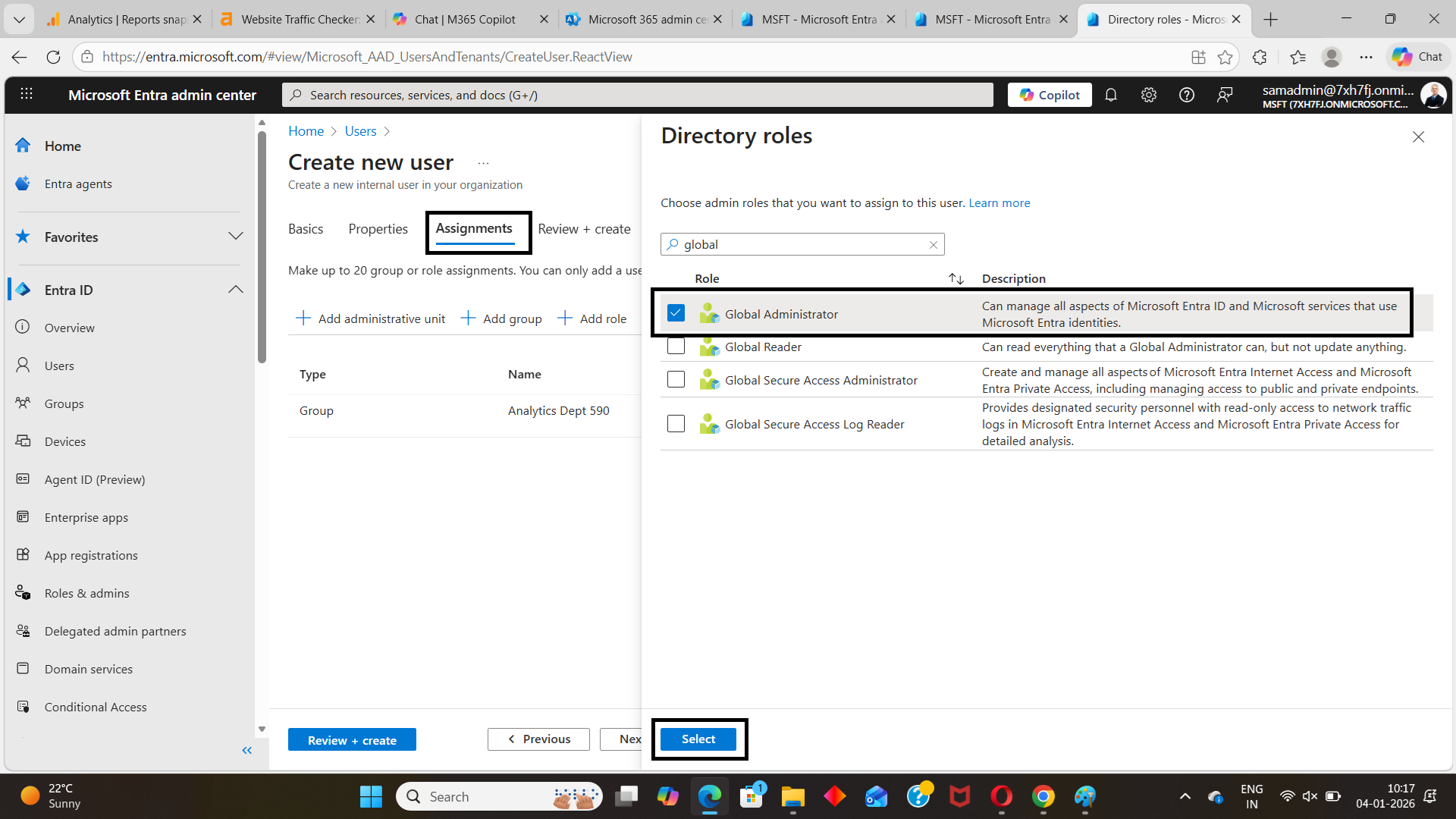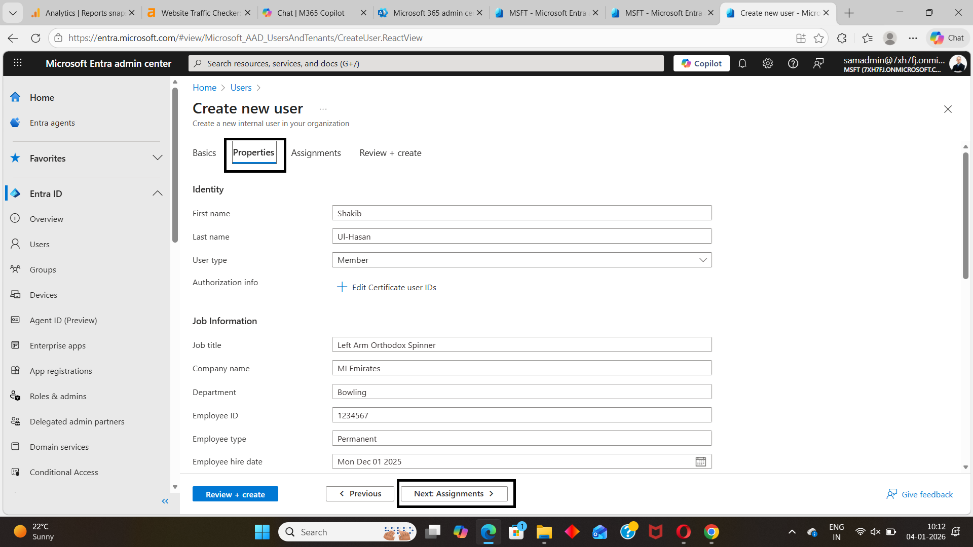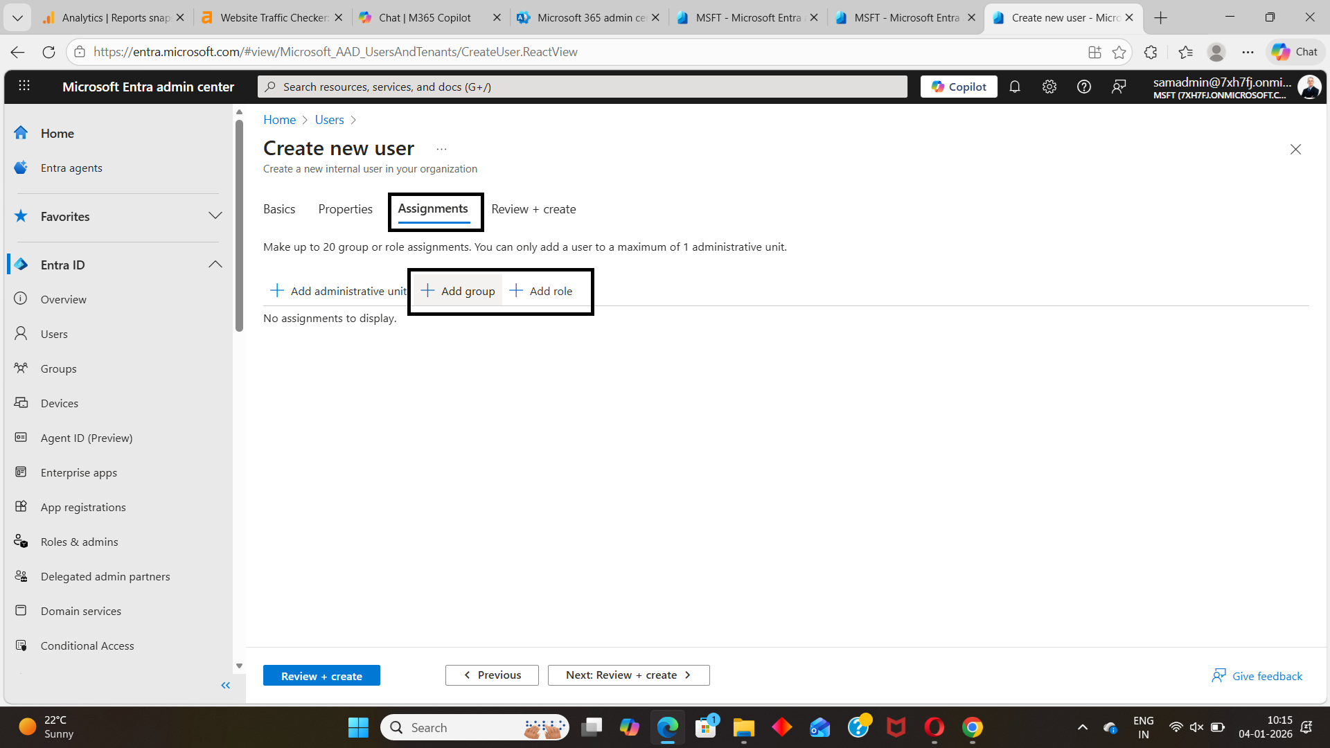 The Assignments tab controls what the user can access after being created. This is where group membership and directory roles are configured in Entra ID.