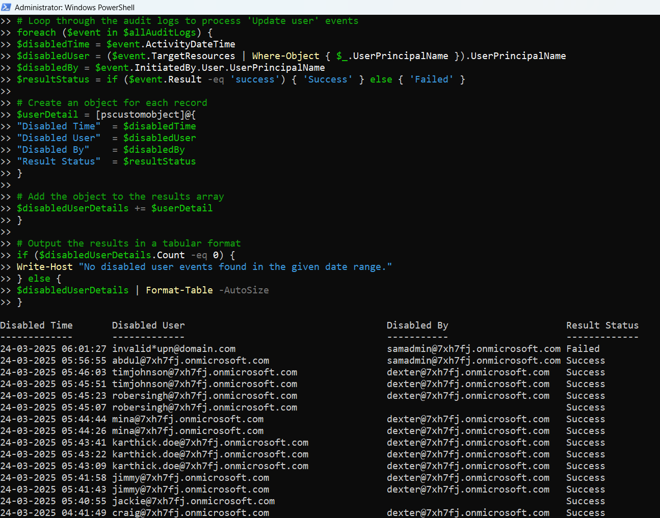 Tracking disabled user accounts is crucial for security and compliance. With Microsoft Graph PowerShell, you can efficiently fetch and analyze user disablement events. This script not only simplifies user management but also ensures transparency in administrative actions. Try it out today and enhance your Microsoft 365 security posture!