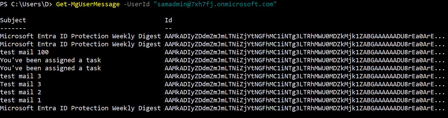 The Get-MgUserMessage cmdlet retrieves messages from a user’s mailbox. You can retrieve all messages, filter specific emails, or extract particular properties for further processing.