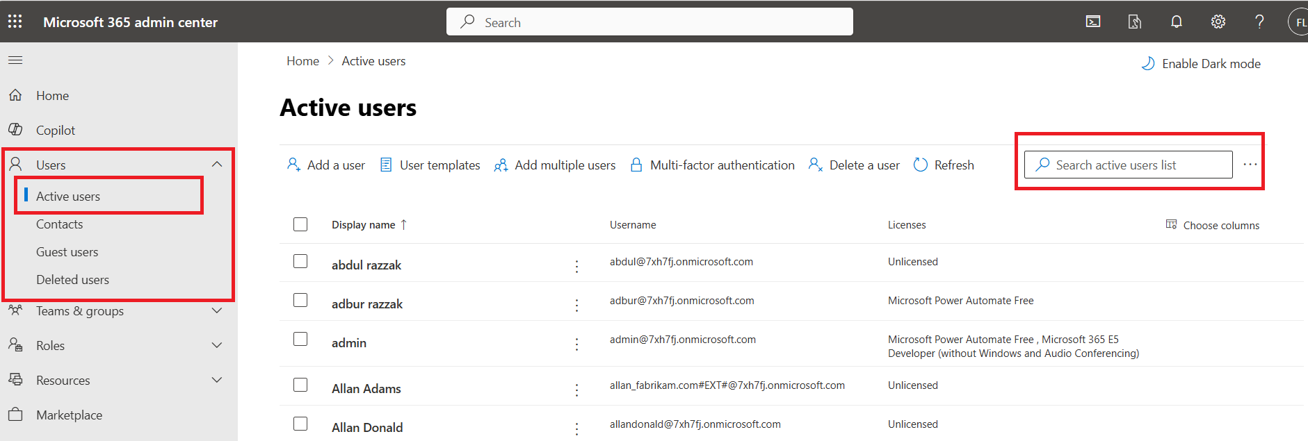 The Microsoft 365 Admin Center offers basic user search functionality but falls short when it comes to advanced attribute filtering.