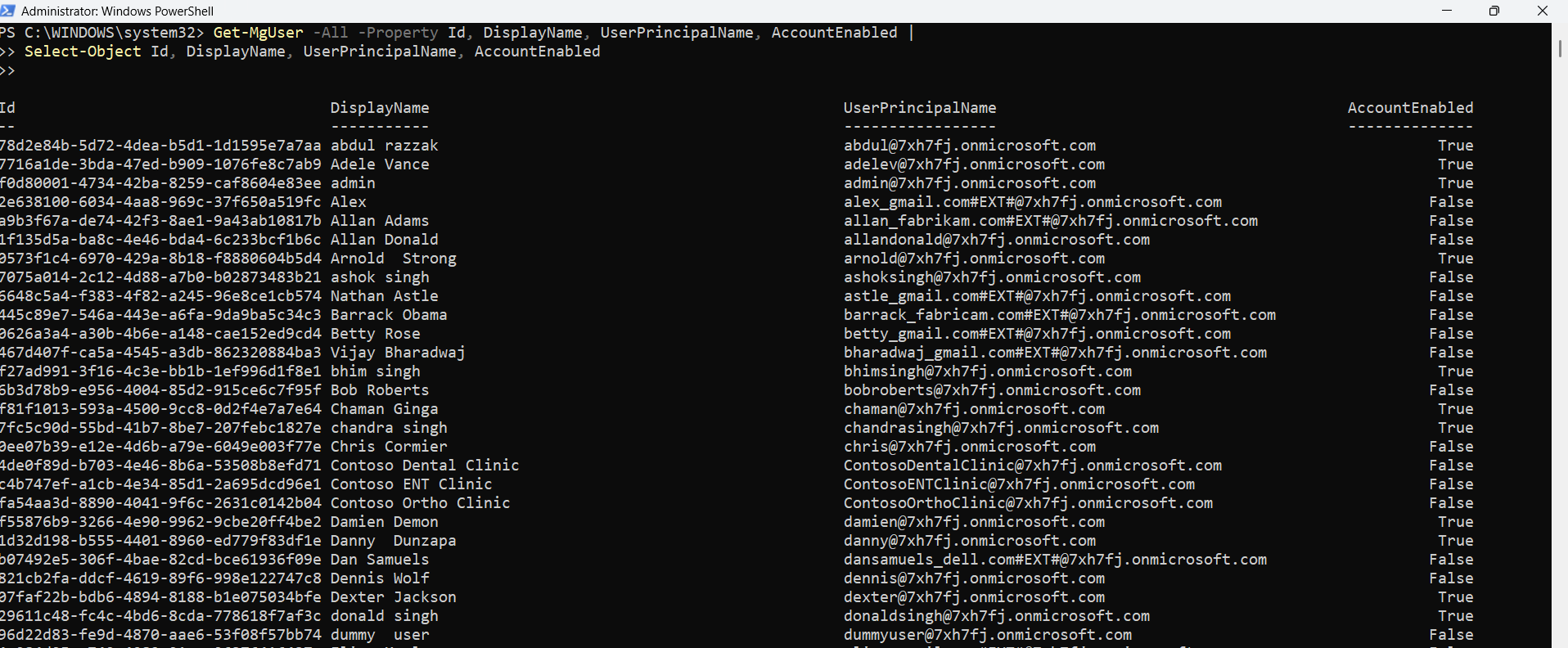 Select-Object Id, DisplayName, UserPrincipalName, AccountEnabled