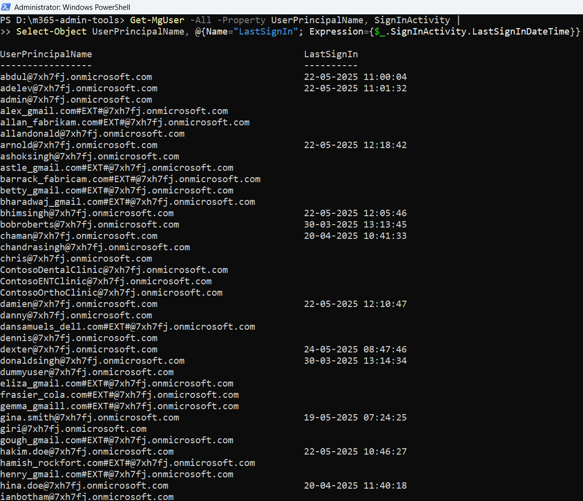 Select-Object UserPrincipalName, @{Name="LastSignIn"; Expression={$_.SignInActivity.LastSignInDateTime}}