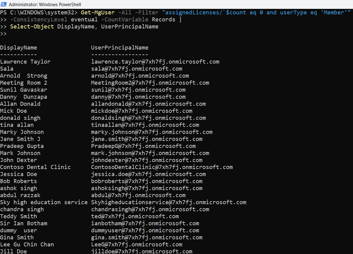 Get-MgUser -All -Filter "assignedLicenses/`$count eq 0 and userType eq 'Member'" `