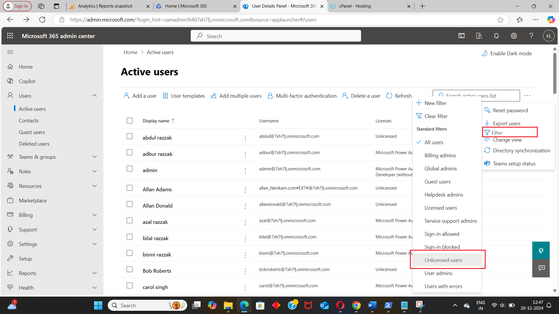 To filter for unlicensed users using Microsoft 365 Admin Center, you have to do the following: