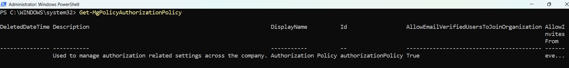 authorizationPolicy object retrieved by Get-MgPolicyAuthorizationPolicy is unique — each tenant has exactly one instance. You don’t need to provide an ID or filter; simply run the cmdlet to fetch the full policy.