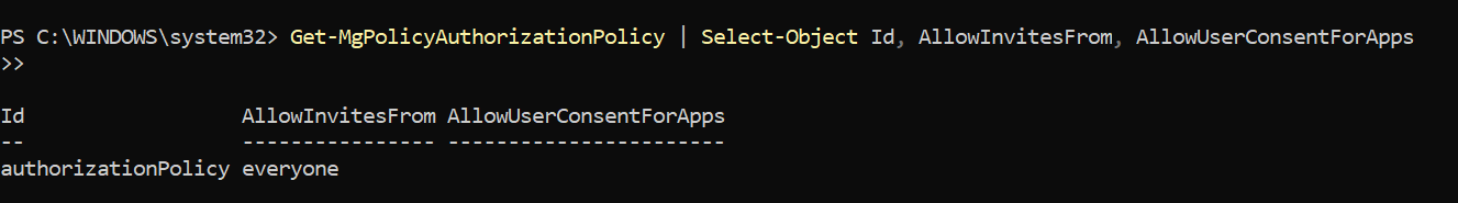 Get-MgPolicyAuthorizationPolicy | Select-Object Id, AllowInvitesFrom, AllowUserConsentForApps