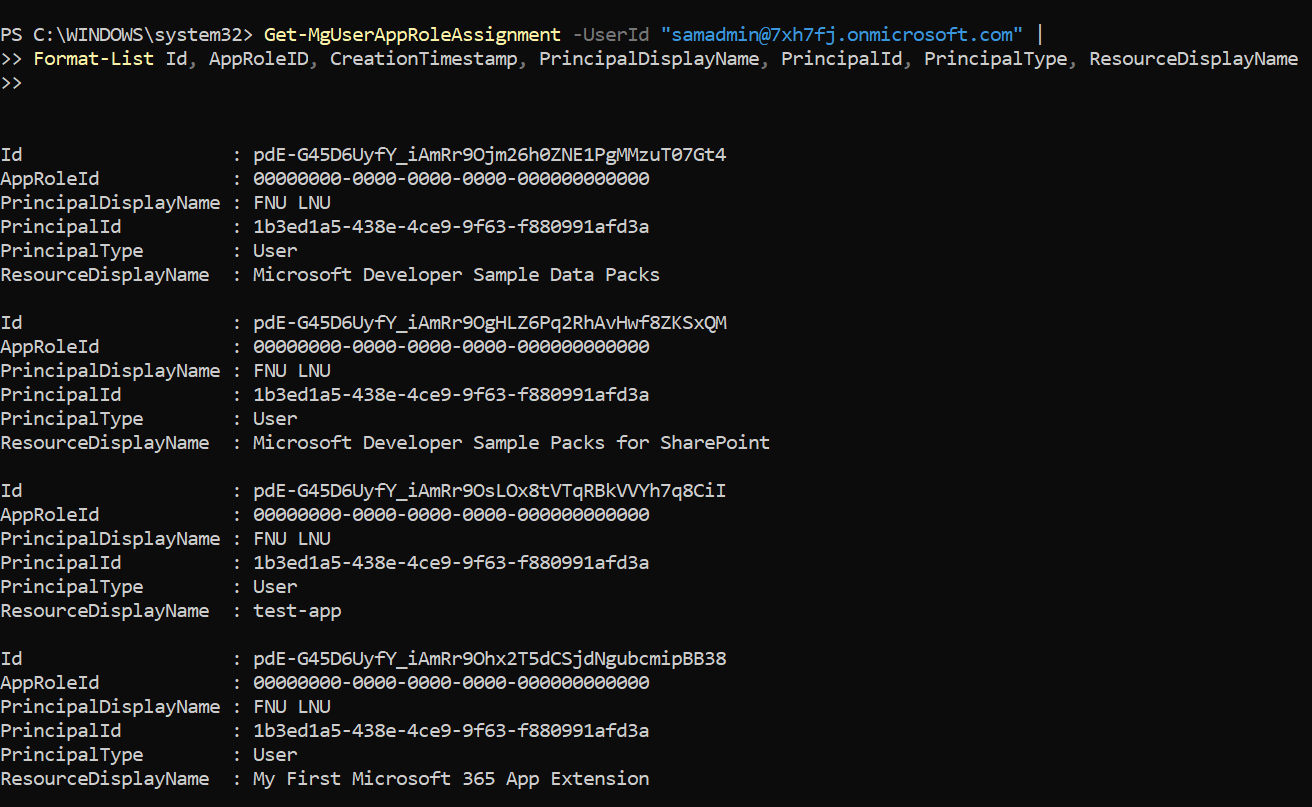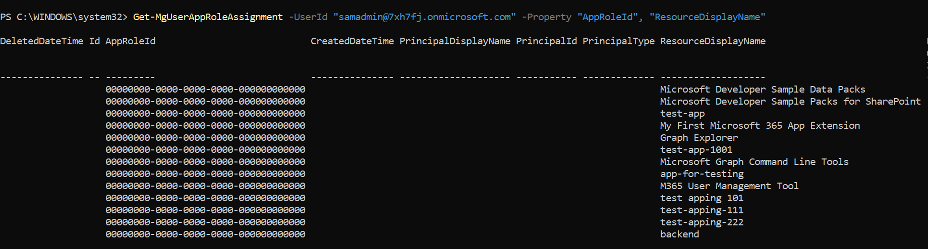 Get-MgUserAppRoleAssignment -UserId "samadmin@7xh7fj.onmicrosoft.com" |