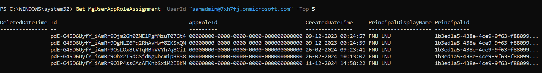 Get-MgUserAppRoleAssignment -UserId "alex.johnson@domain.com" -Top 5