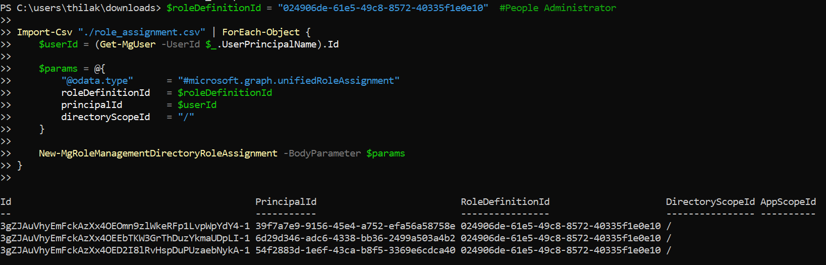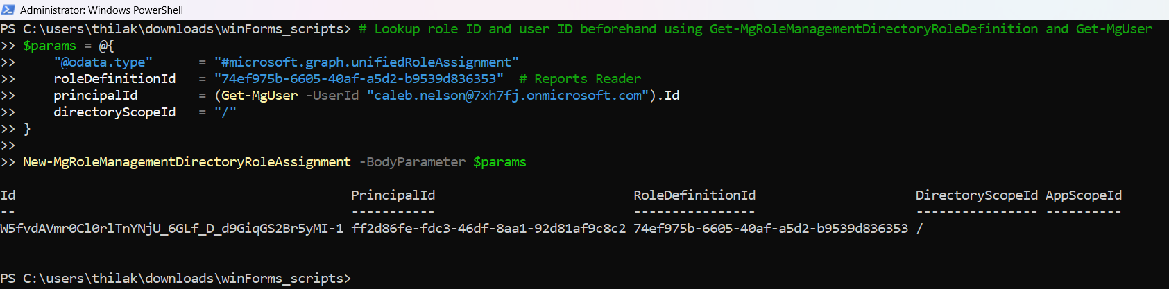 With just a few lines of Graph PowerShell, administrators can now automate and audit role assignments, aligning perfectly with least privilege principles, delegated admin responsibilities, and governance policies.