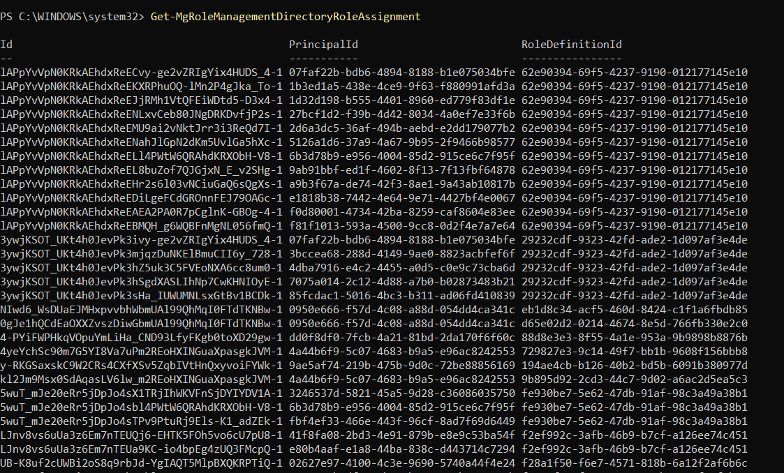 This returns a list of all role assignments in your directory. To extract additional details (e.g., names), you'd combine it with Get-MgUser, Get-MgGroup, or Get-MgServicePrincipal.