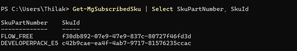 Get-MgSubscribedSku | Select SkuPartNumber, SkuId