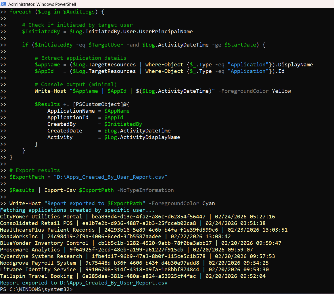 This script provides a focused way to track applications created by a specific user, making it highly valuable for: 1) Security investigations, 2) Governance enforcement and 3) Compliance reporting.
