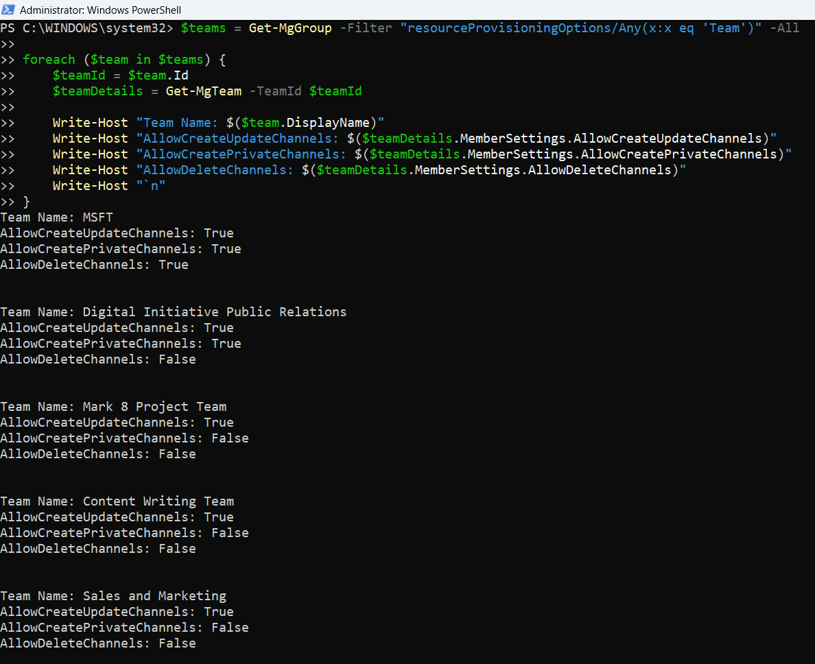 Write-Host "AllowDeleteChannels: $($teamDetails.MemberSettings.AllowDeleteChannels)"