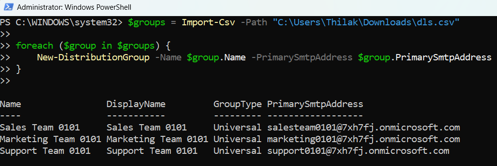 The foreach loop processes each row in the CSV, calling New-DistributionGroup to create each DL using the provided name and SMTP address.