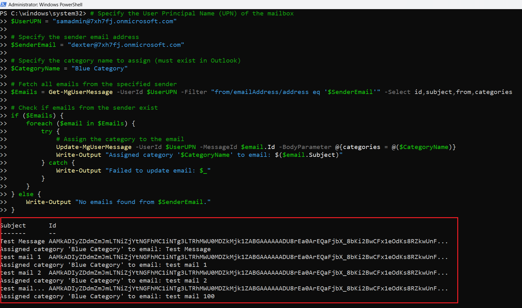 This Graph PowerShell script simplifies email categorization in Outlook by automatically tagging emails from a specific sender with a predefined category. Administrators can use this script to: i) Organize important emails automatically, ii) Process multiple users and senders efficiently, iii)Automate categorization for improved mailbox management.