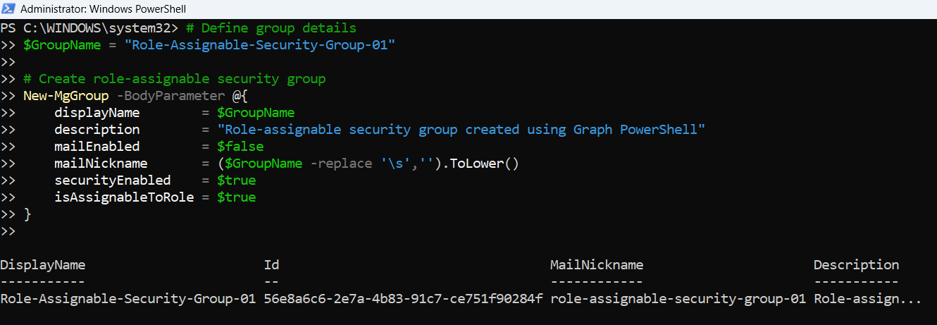| Authorization_RequestDenied | The signed-in account does not have permission to create role-assignable groups. | Run the script using an account with sufficient Entra ID privileges, such as Privileged Role Administrator. |