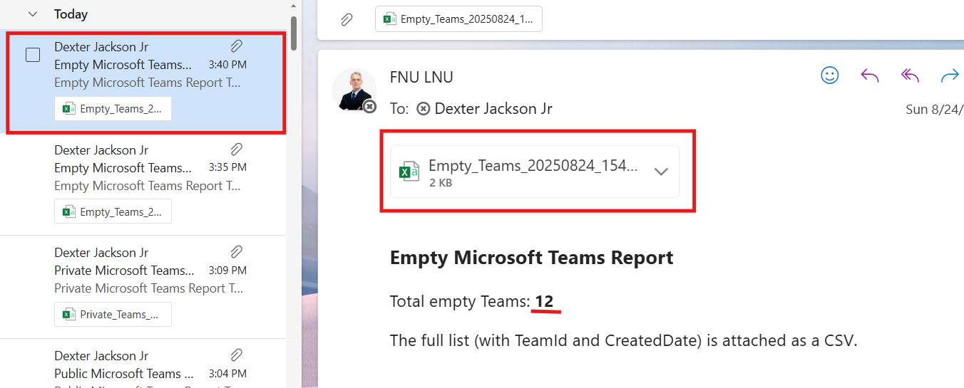 This Graph PowerShell script addresses that by scanning your tenant, finding Teams with no members, and emailing the results (as a CSV file) to the administrator. The report also includes useful details like TeamId and CreatedDate for easier governance decisions.