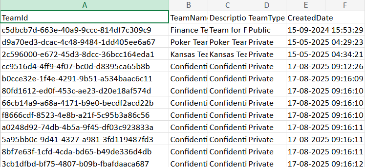 Captures TeamId, TeamName, Description, Visibility (converted to Public/Private), and CreatedDate.