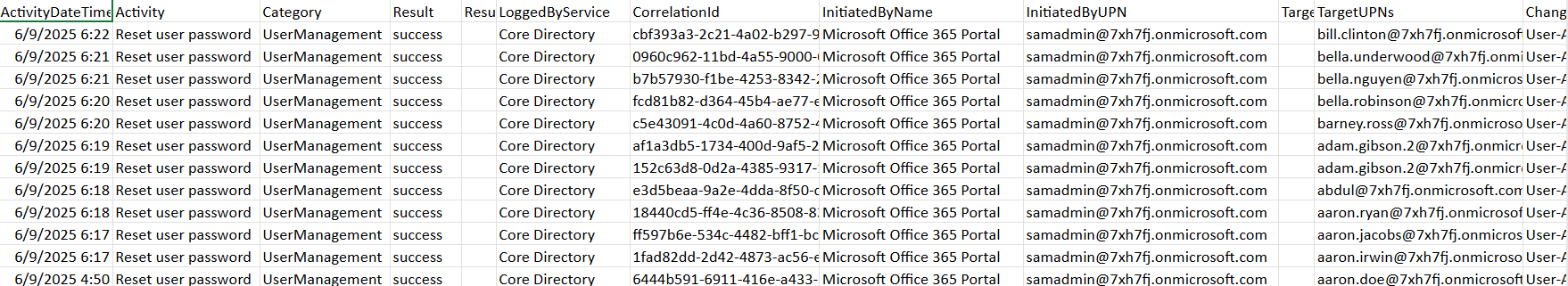 | Empty CSV | No password reset events in the timeframe | Increase $DaysBack; confirm events exist in Entra admin portal. |
