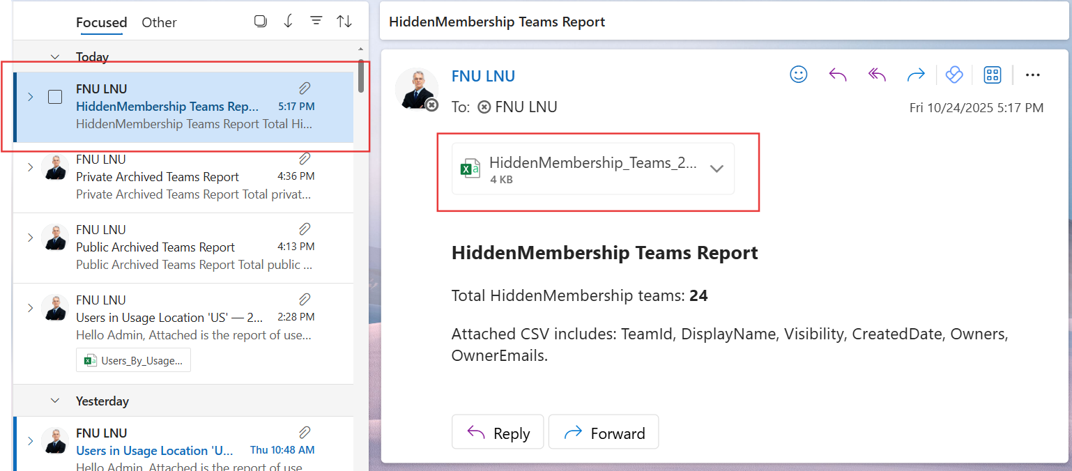 This Graph PowerShell script gives administrators clear visibility into Teams configured with HiddenMembership, often used for confidential collaboration. By automating this report and delivering it via email, IT admins can maintain proper oversight of hidden Teams, ensuring compliance and visibility into sensitive collaboration spaces across Microsoft 365.