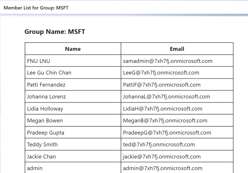 The script creates a clean, formatted HTML table showing member display names and emails using AdditionalProperties.