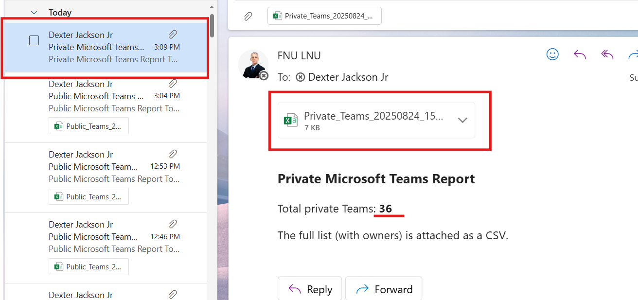 This script solves that by pulling a full list of all private Microsoft Teams, including owner details, saving it into a CSV, and emailing it directly to the administrator.