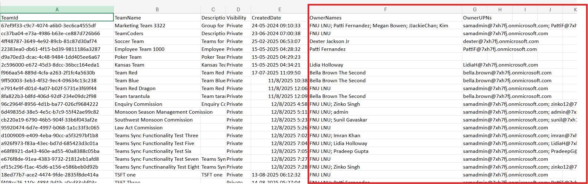 For each private Team, the script retrieves owner objects and resolves them into clean DisplayName and UserPrincipalName. Multiple owners are concatenated into semicolon-separated lists.