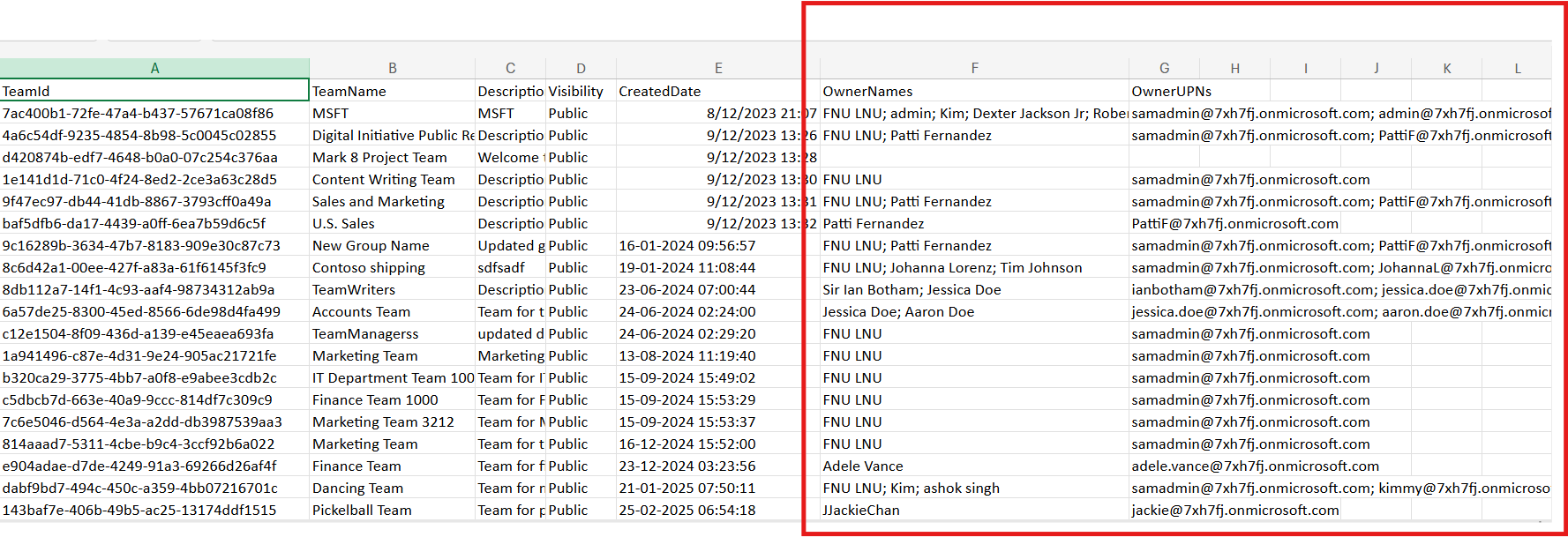 For each public Team, it fetches owners, resolves them to user objects for clean DisplayName and UPN, and aggregates multiple owners in semicolon-separated lists.