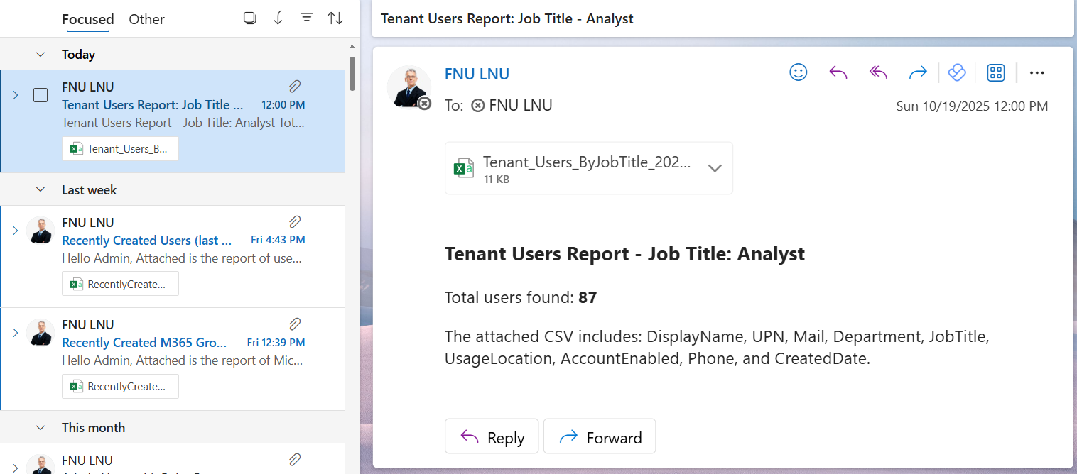 This Graph PowerShell script provides a quick and automated way to fetch users by job title, generate a detailed CSV report, and deliver it to administrators via email. It eliminates the need for manual exports, ensures timely data delivery, and helps maintain better visibility into your organization’s workforce. When scheduled regularly, it becomes a powerful reporting utility for both IT and HR teams.