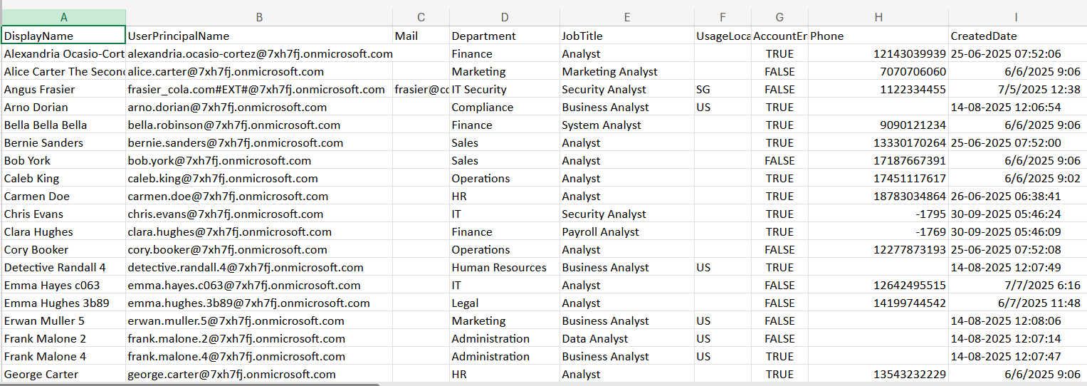 <p>The attached CSV includes: DisplayName, UPN, Mail, Department, JobTitle, UsageLocation, AccountEnabled, Phone, and CreatedDate.</p>