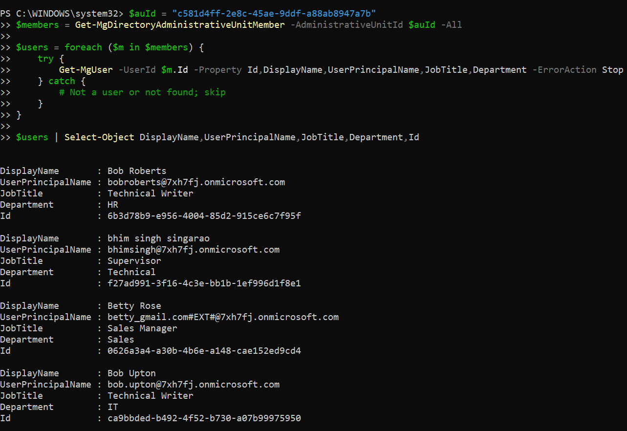 Empty output | AU has no user members, or IDs are groups/devices only | Validate AU contents in Entra admin center; optionally add logging in catch to verify skipped IDs. |
