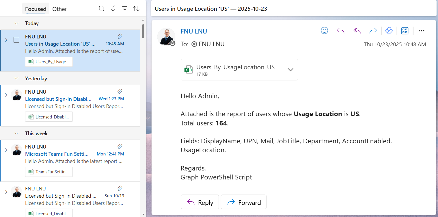 This Graph PowerShell script makes it simple for administrators to identify users by usage location within Microsoft 365. By automating report generation and email delivery, it enhances both visibility and efficiency, helping admins perform license audits, regional compliance checks, or user distribution analysis effortlessly.