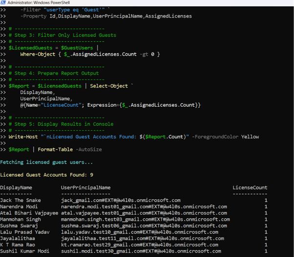The script prints the licensed guest accounts directly in the PowerShell console.