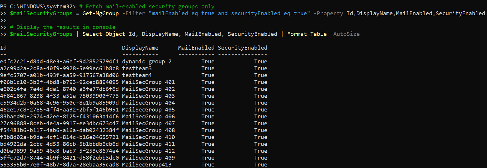 $mailSecurityGroups | Select-Object Id, DisplayName, MailEnabled, SecurityEnabled | Format-Table -AutoSize