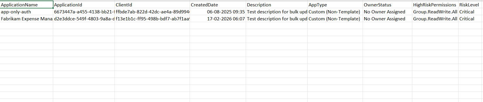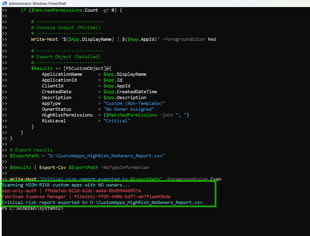 This script enables administrators to quickly identify and export such critical-risk applications, making it easier to take corrective actions such as assigning owners, reducing permissions, or removing unused apps.