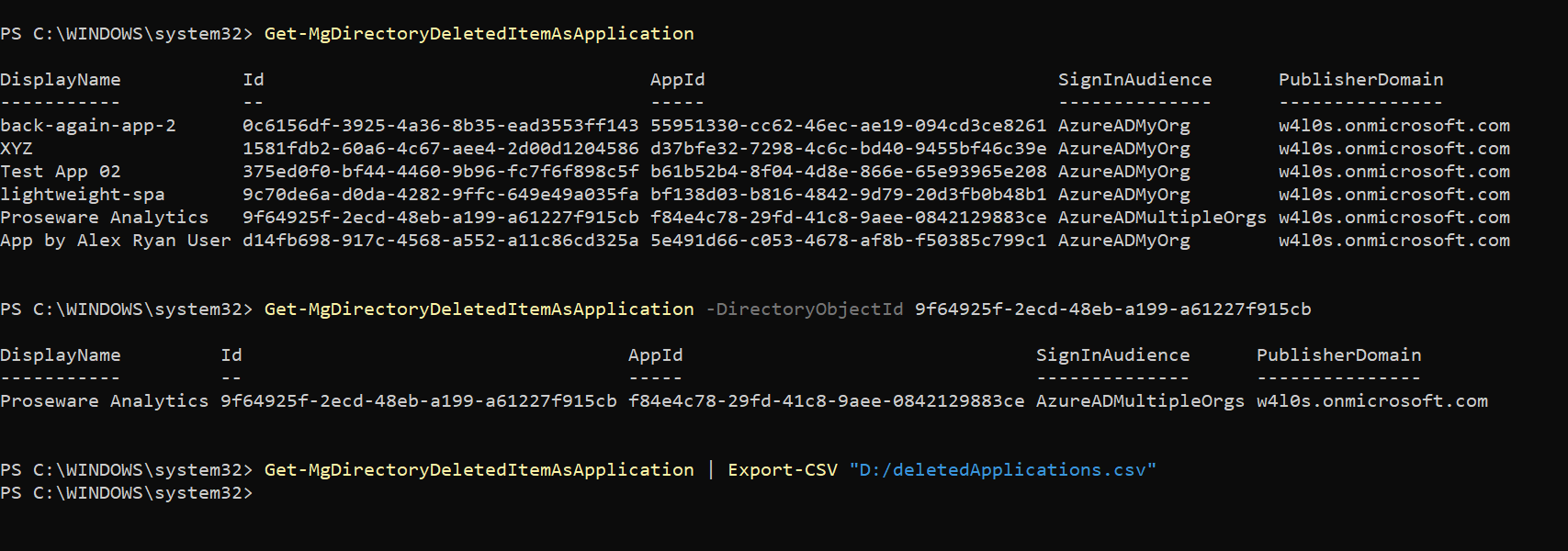 Get-MgDirectoryDeletedItemAsApplication | Export-CSV "D:/deletedApplications.csv"