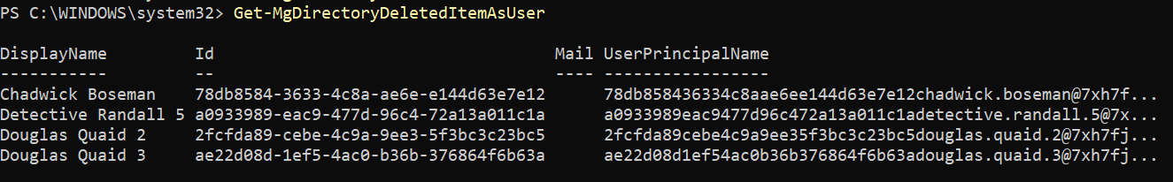 Get-MgDirectoryDeletedItemAsUser | Select-Object Id, DisplayName, UserPrincipalName, DeletedDateTime