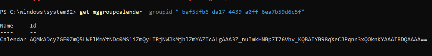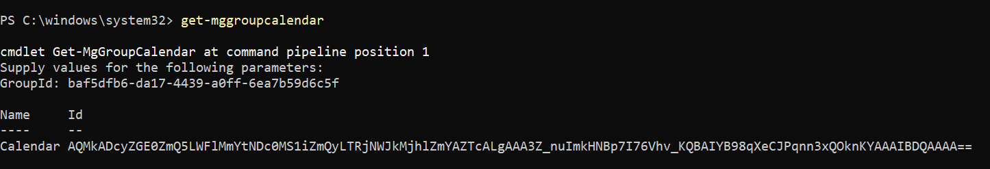In this example, running Get-MgGroupCalendar without the -GroupId parameter prompts the user to input the Group ID manually.