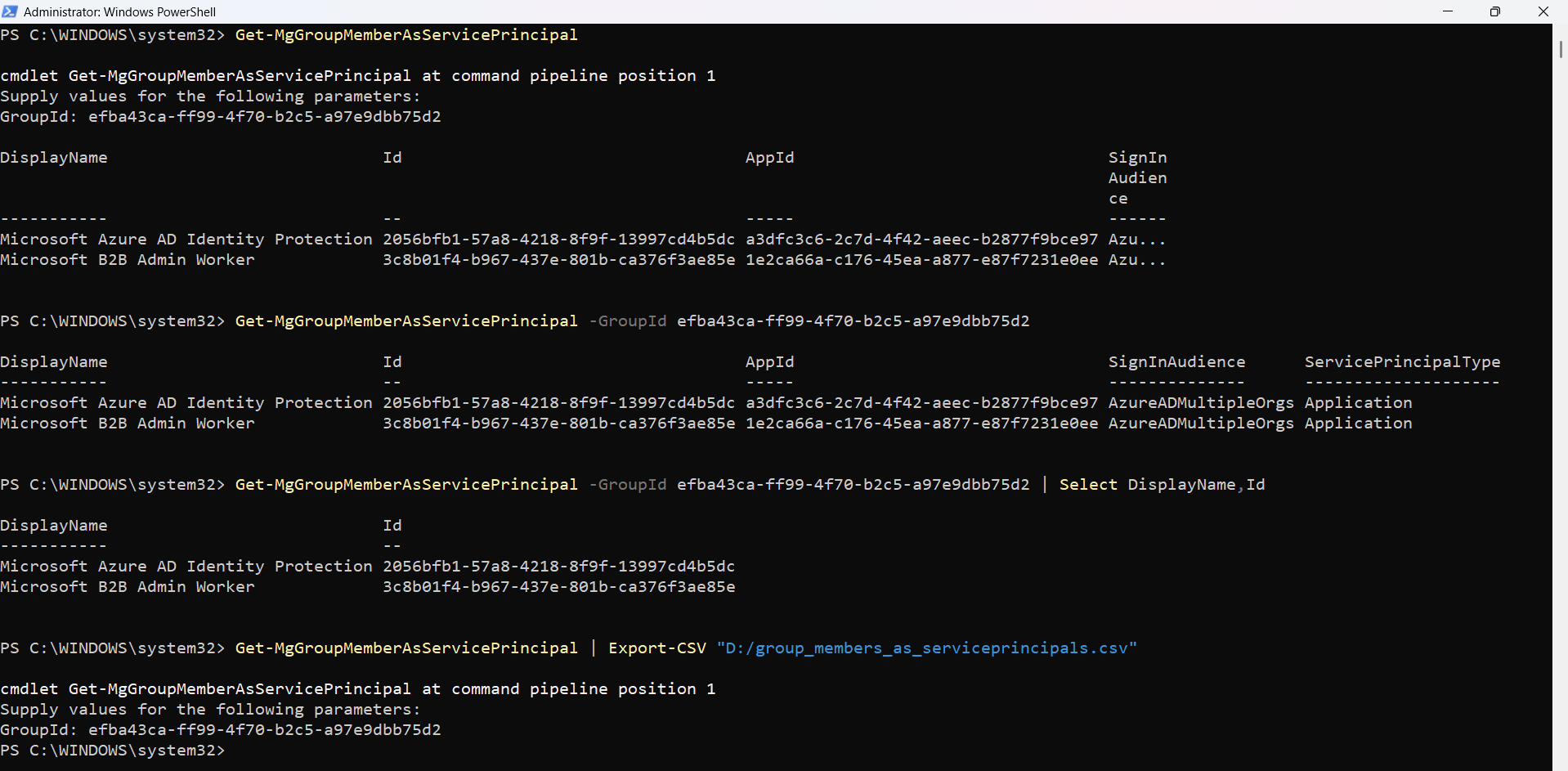 Get-MgGroupMemberAsServicePrincipal | Export-CSV "D:/group_members_as_serviceprincipals.csv"