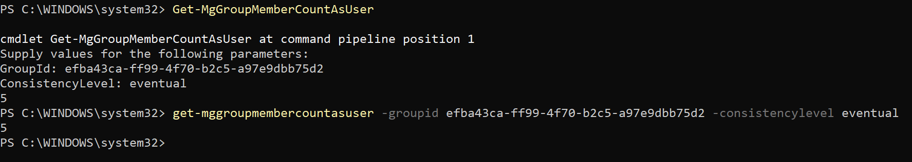 Get-MgGroupMemberCountAsUser -GroupId efba43ca-ff99-4f70-b2c5-a97e9dbb75d2 `-ConsistencyLevel Eventual