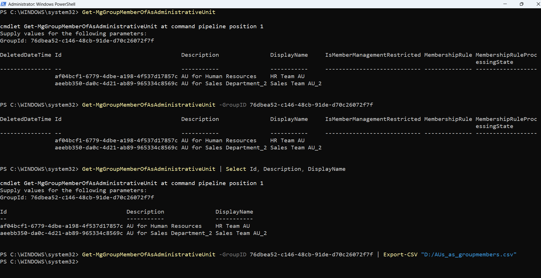 Get-MgGroupMemberOfAsAdministrativeUnit -GroupID 76dbea52-c146-48cb-91de-d70c26072f7f | Export-CSV "D:/AUs_as_groupmembers.csv"