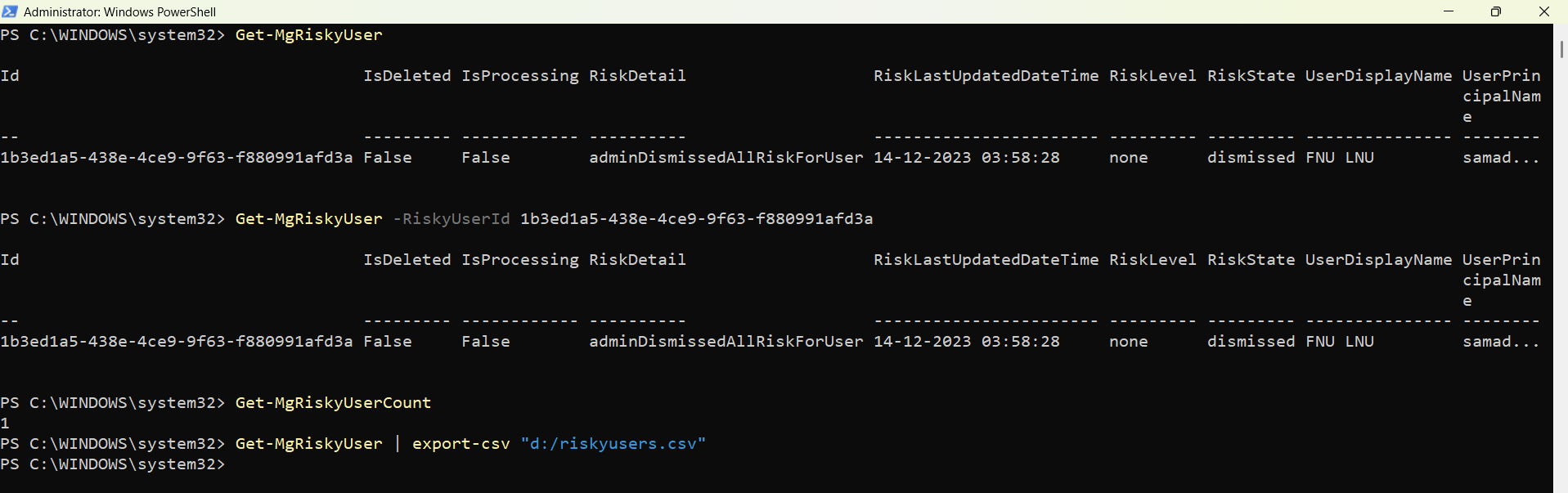 Get-MgRiskyUser | Export-Csv "d:/riskyusers.csv"