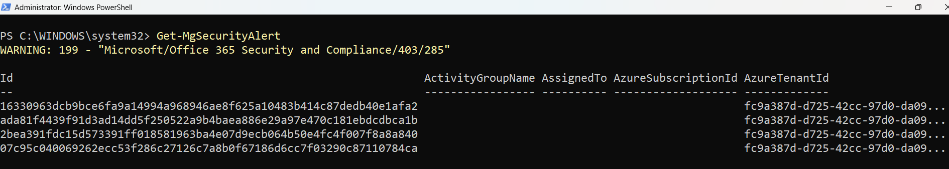 | Empty output | No alerts available | Confirm alerts exist in the tenant or broaden the query scope. |