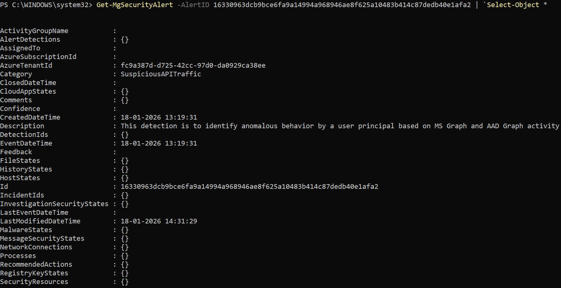 When executed without parameters, the console prompts you to provide an AlertId. Once entered, the cmdlet retrieves details for that specific security alert.