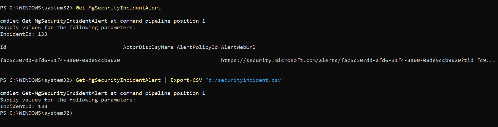 Get-MgSecurityIncidentAlert | Export-CSV "d:/securityincident.csv"