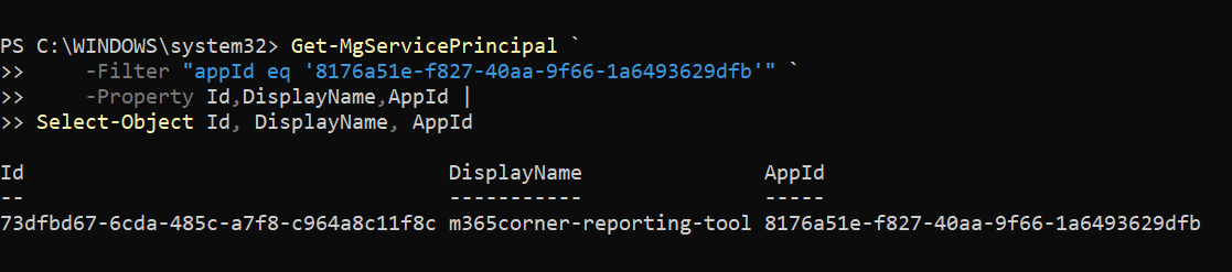Select-Object Id, DisplayName, AppId